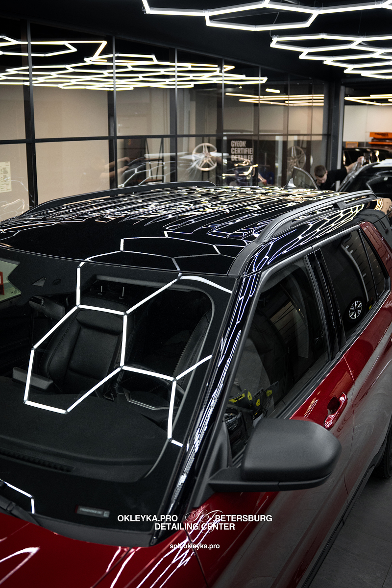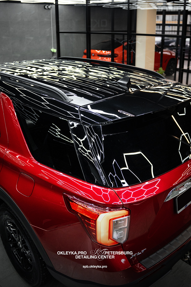Мы оклеили крышу, стойки и спойлер этого Ford Explorer черной полиуретановой пленкой, и результат говорит сам за себя. Ярко-красный кузов + глянцевая черная крыша = идеальный контраст!