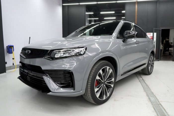 Задача: полное обновление внешнего вида автомобиля Geely Tugella: изменение цвета, установка дополнительного оборудования, перетяжка.