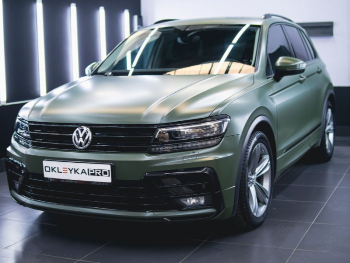 Выполнили полную оклейку кузова Volkswagen Tiguan в цветной винил Oracal 970 (nato olive matt), сделали антихром.